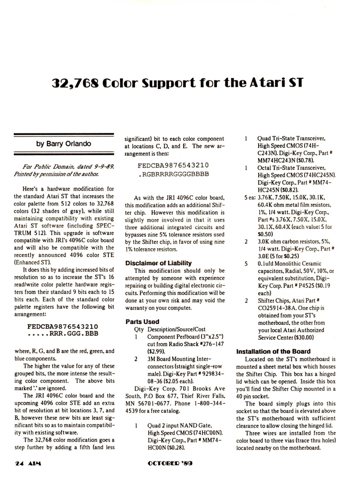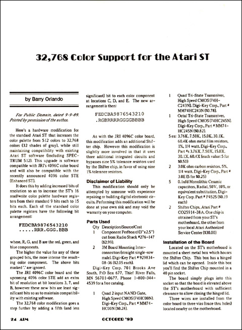tam zamieszczony artykuł Barry'ego Orlando z opisem i SCHEMATEM!!! jego pomysłu na rozszerzenie palety standardowego komputera ST do 32K kolorów (32768) będącego