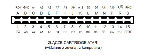 Tak wygląda złącze w 65XE, 130XE, 800XE widziane z tyłu komputera z zewnątrz. Styki oznaczone literami znajdują się u góry złącza. W 600XL, 800XL należy patrzeć od tyłu komputera - po rozchyleniu klapek widzimy