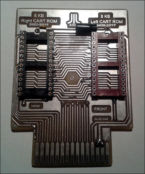 na dwóch układach 27C64. Można bez problemu wykonać cartridge 16KB na jednej pamięci 27C128. Ta płytka 2x8KB jest ciut bardziej uniwersalna ponieważ można zrobić