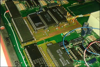 40-pin pod ANTIC, drugi rząd pinów precyzyjnych a potem po kolei rzędy podstawek kończąc na podstawkach pod 74HCT132 pamiętając o lutowaniu z góry i z dołu płytki.