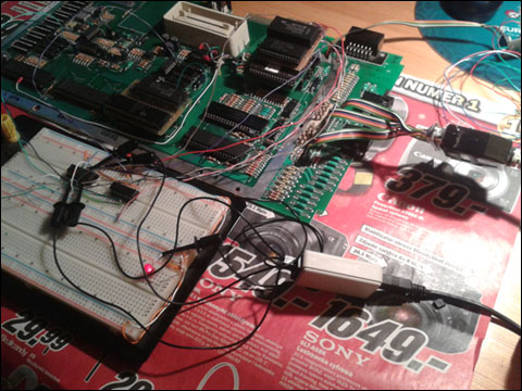 projekcie sygnały były pobierane z następujących lokalizacji: R/W z nóżki 13 układu 74LS375 - U28 Phi2 z nóżki 11 układu 74LS08 - U18 A14 z nóżki 4 MMU A15 z nóżki 5 MMU