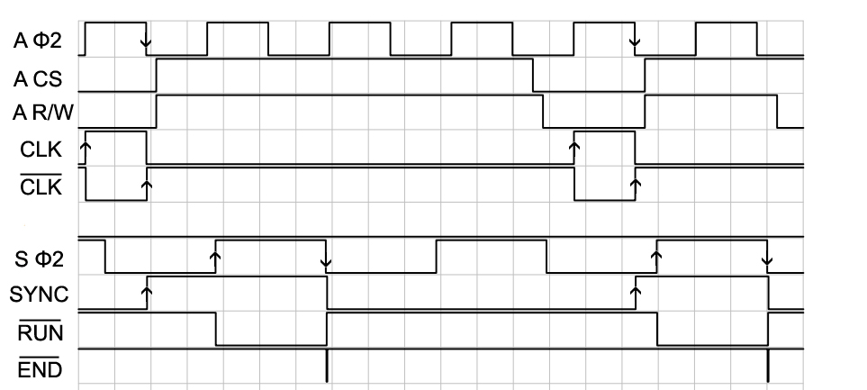 A /CS - chip select oraz A R/W - niski co przygotowuje układ IO do zapisu danej. W tym czasie również ustalają się adresy na szynie adresowej. Bramka IC4D neguje zegar A PHI2. W czasie gdy A /CS