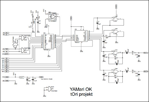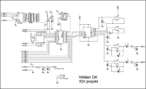 YAMari składa się z 4 układów scalonych, kwarcowego generatora scalonego oraz garstki elementów biernych. Na schemacie widoczne są układy: