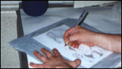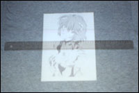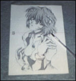 malowania białych elementów postaci. Dokładniej mówiąc - są to części kombinezonu Rei :) Proszę zwrócić uwagę na czystą kartkę, która jest podkładką pod dłoń aby nie rozmazać grafitu na koszulce oraz