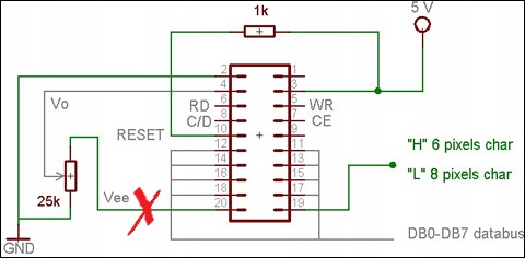 wyjścia z pin20, a cała reszta pozostaje bez zmian w podłączeniu sygnałów do LCD. Potencjometr kontrastu jest zasilany z układu syntezatora napięciem dodatnim i ujemnym i aby wszystko działało prawidłowo należy