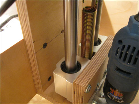 Sprężyna ma za zadanie ustalenie wysokości wiertła nad płytką oraz wytwarzanie sił powrotu wózka po zwolnieniu dźwigni. Widok szczegółów dźwigni opuszczania wózka. Wykonanie dla praworęcznych :) Widok frontalny na całość urządzenia. Na zdjęciu jest widoczna nakrętka motylkowa,