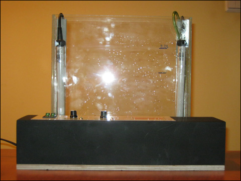 lakierem w spray'u umieszczone na podstawie ze sklejki 10mm. Widoczny pionowy element ze sklejki trzymający pojemnik szklany z tyłu urządzenia.