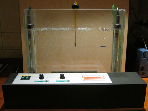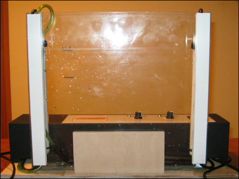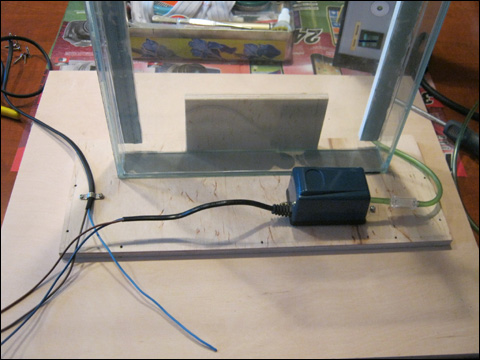 roztwór trawiący i przy okazji wyrównującej temperaturę cieczy w pojemniku. Widać tu także pojemnik szklany przyklejony klejem epoksydowym do podstawy ze sklejki.
