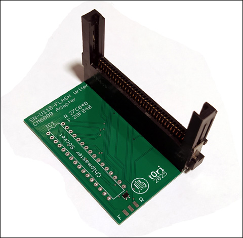 Płytka adaptera z wlutowanym slotem Adapter z kartą SN-U100-02 w programatorze Adapter jest bardzo prostym układem. Posiada jeden przełącznik ROM-FLASH,